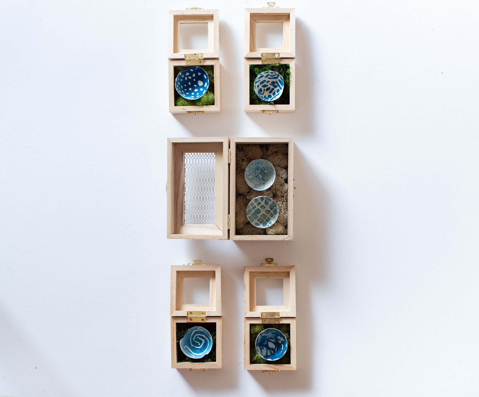 Cyanotype printed in egg shell, pine boxes, moss, glue